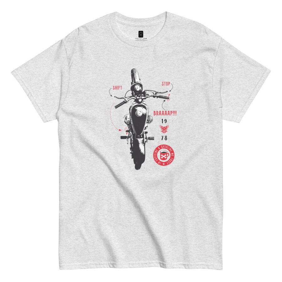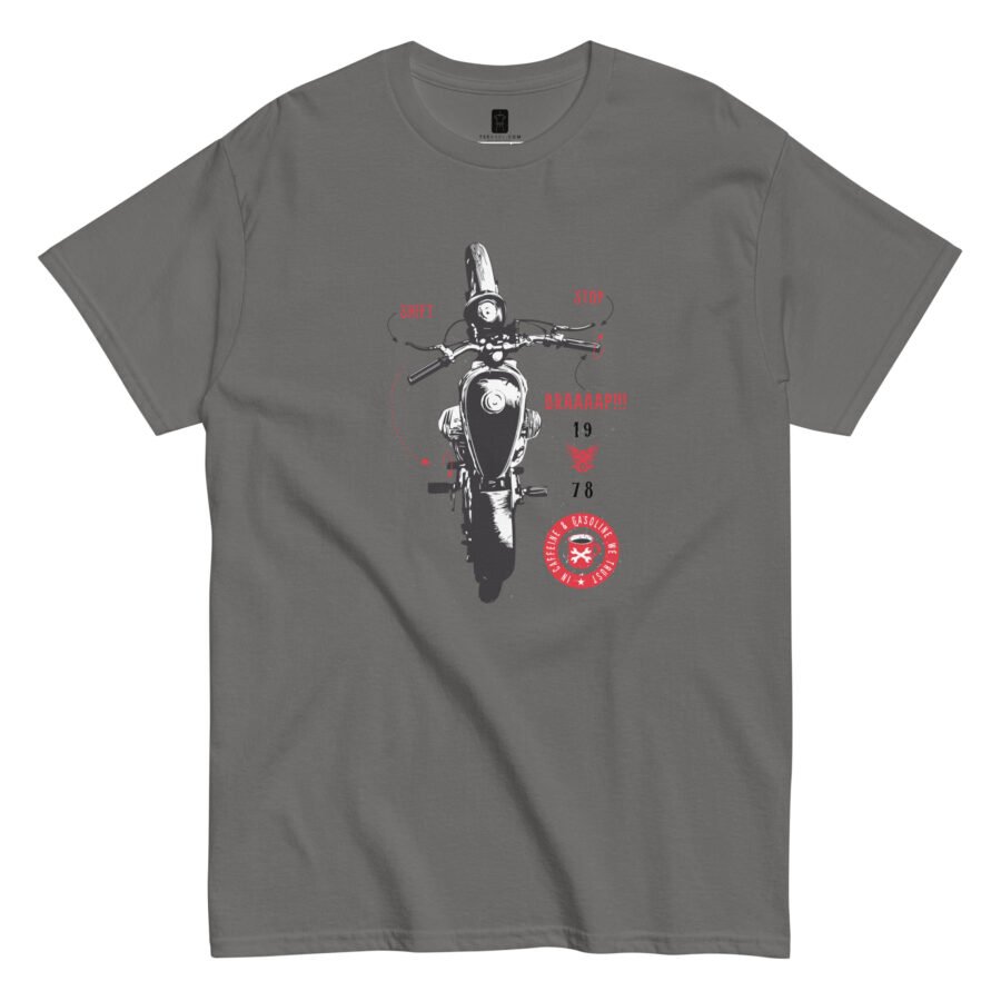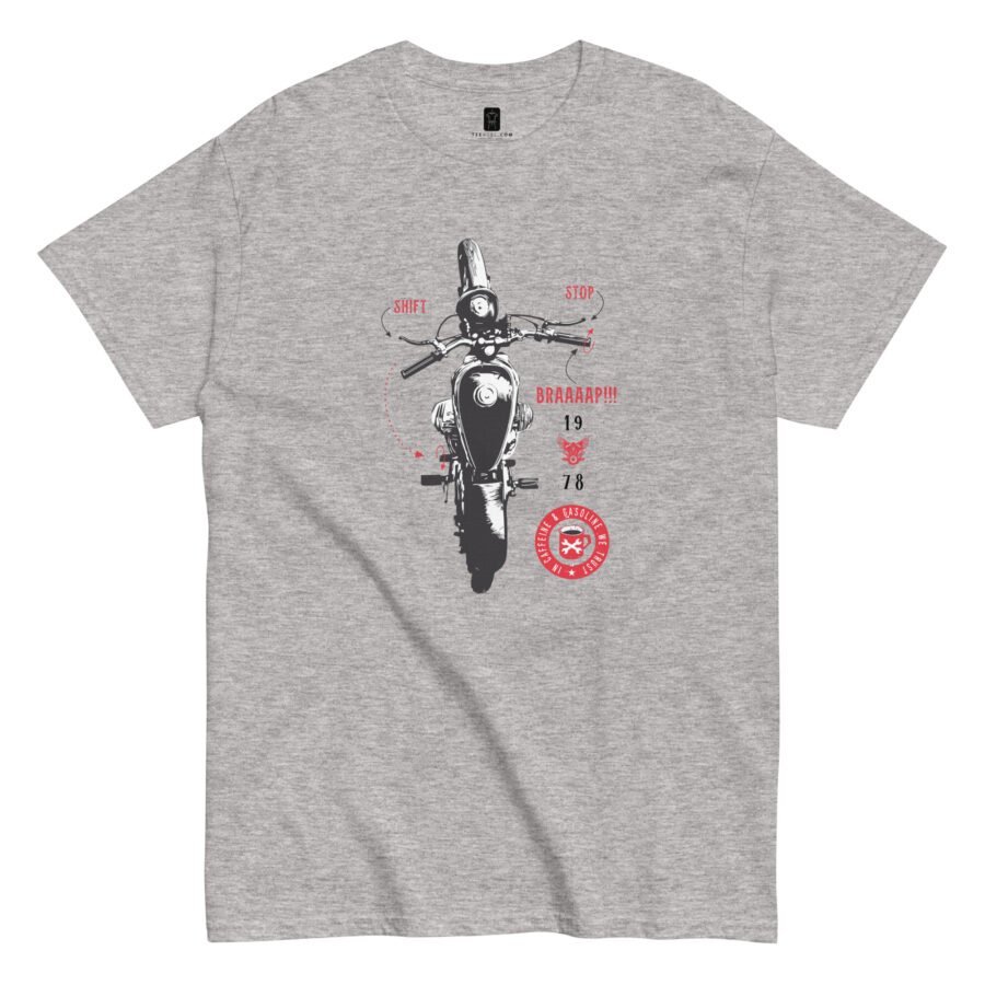 The eye-catching design resonates with bikers, coffee lovers, and automotive enthusiasts who understand that some of life’s greatest pleasures come from the perfect blend of caffeine and horsepower. Whether you’re heading to a bike rally, grabbing your morning brew, or simply expressing your dual passions, this tee delivers authentic style.