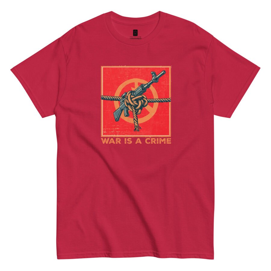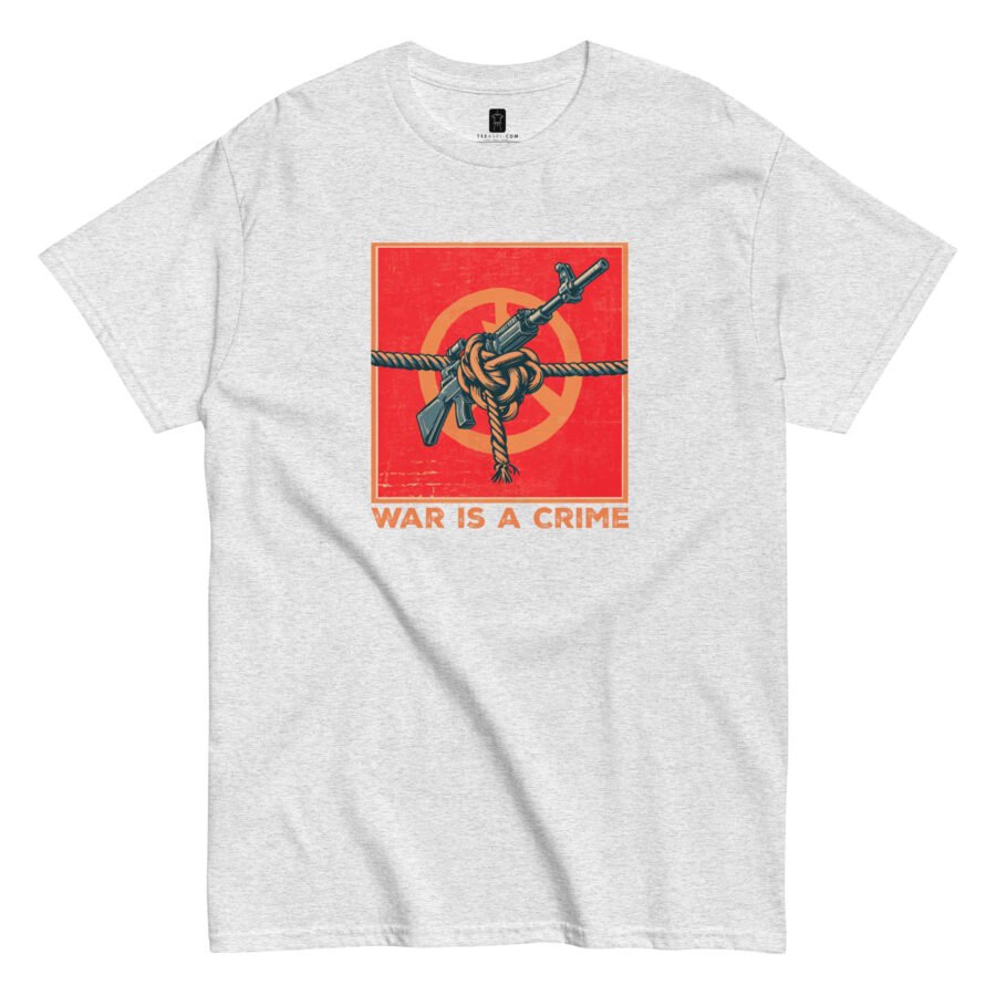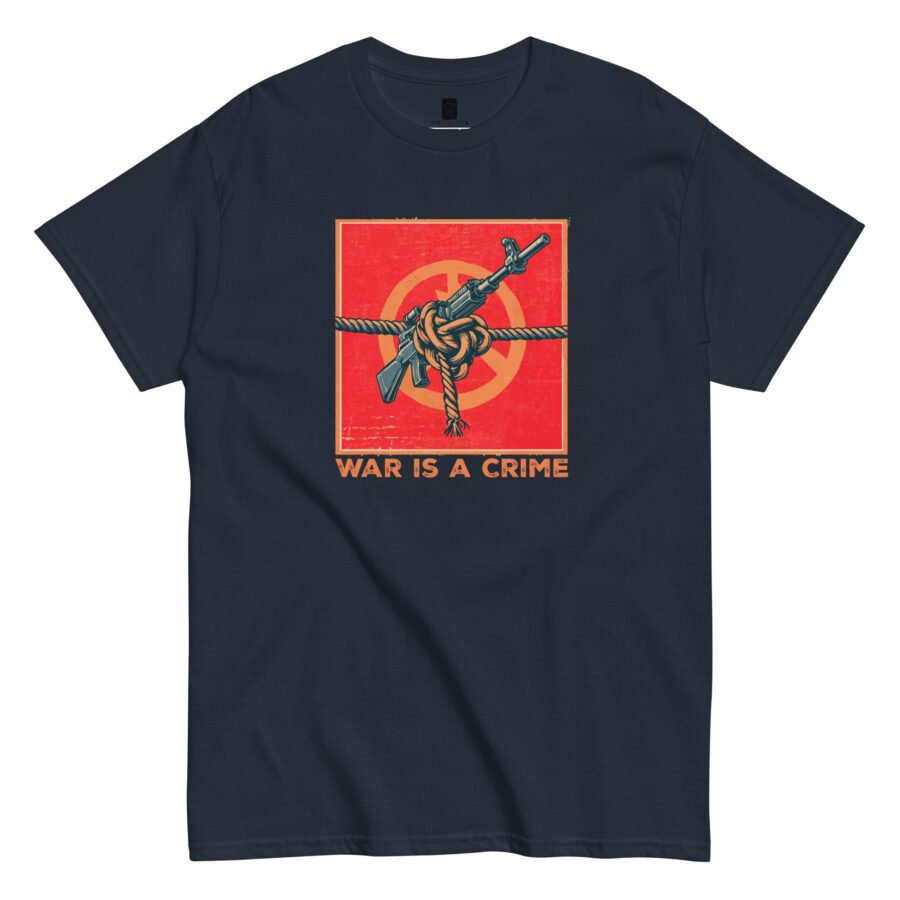 Our “War Is A Crime” Classic Tee features original artwork of a firearm tied securely in a knot—an impossible shape representing the impossible logic of war itself. It’s a visual paradox that challenges the viewer to reconsider what strength really means.